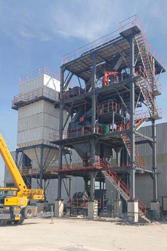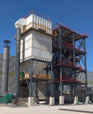 原料經(jīng)過電子秤進(jìn)入到皮帶輸送機(jī)中,由全封閉的提升機(jī)將物料入到五孔碾磨制砂機(jī)內(nèi)進(jìn)行破碎處理,再由空氣篩對破碎后的物料進(jìn)行篩分、選粉處理,篩分后的較大物料會返回五孔碾磨制砂機(jī)中進(jìn)行二次破碎,符合要求的砂子則經(jīng)過加濕拌合機(jī)由傳送帶輸送至成品倉中;篩分過程中的粉塵會經(jīng)粗細(xì)粉分離機(jī)進(jìn)入到布袋收塵器內(nèi),而其中較大的粗顆粒會在粗細(xì)粉分離機(jī)的作用下,按需求在成品砂中進(jìn)行回?fù)?,?xì)粉塵將通過風(fēng)力進(jìn)入到布袋收塵器,作為副產(chǎn)品進(jìn)行使用。